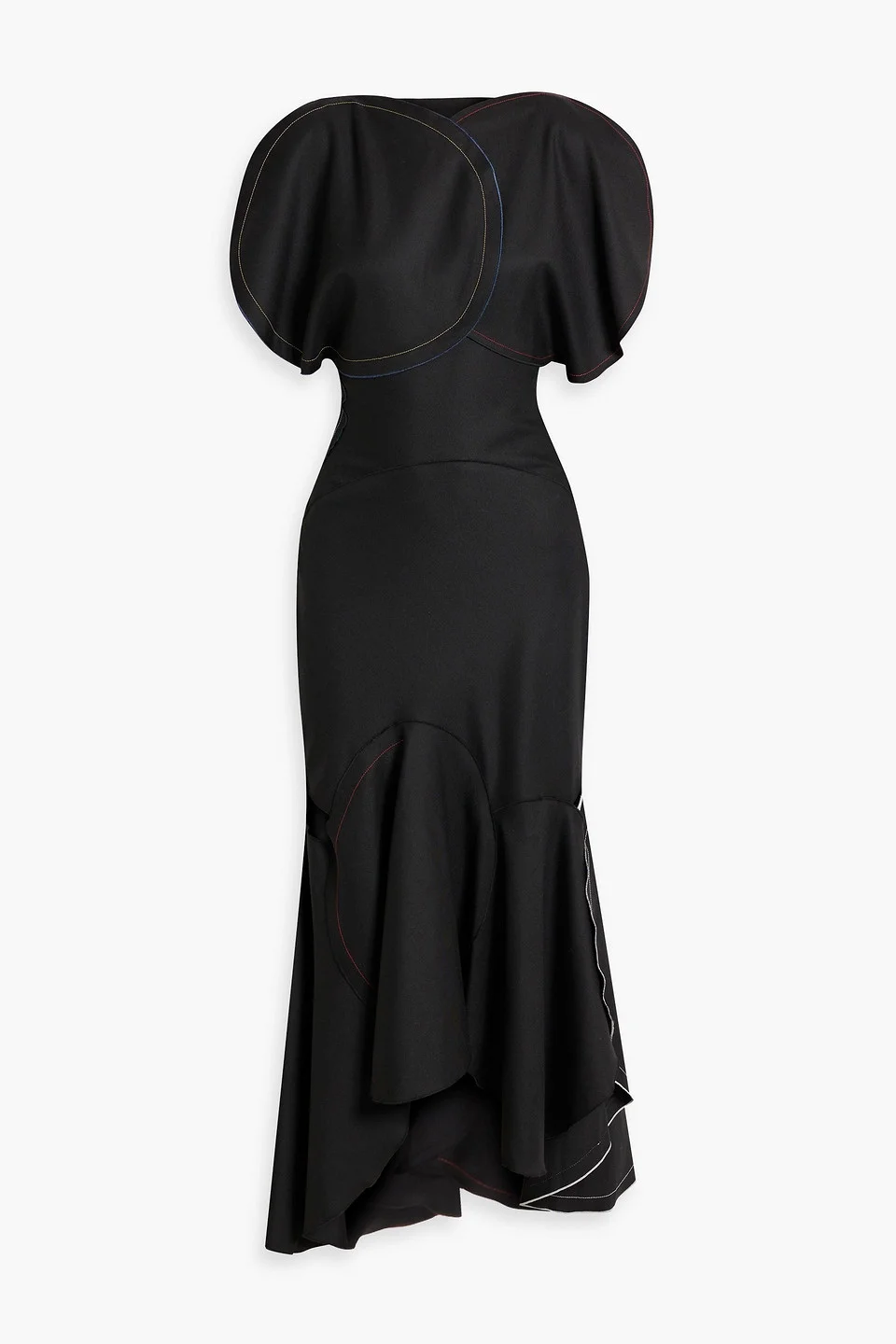 Dress twill topstitching cutout slit sleeves front slit handkerchief hem concealed hook and zip fastening at back mid-weight, slightly stretchy fabric dry clean made in uk This exquisite black midi dress by Victoria Beckham is a true work of art. Crafted from slightly stretchy twill, it features distinctive circular panels that create a captivating silhouette. The gathered handkerchief hem flows with every step, while the cutout bodice and skirt reveal flashes of skin. Match your bag to the colorful topstitching. 53% Polyester 43% Virgin Wool 4% Elastane Product Code 1647597349188152