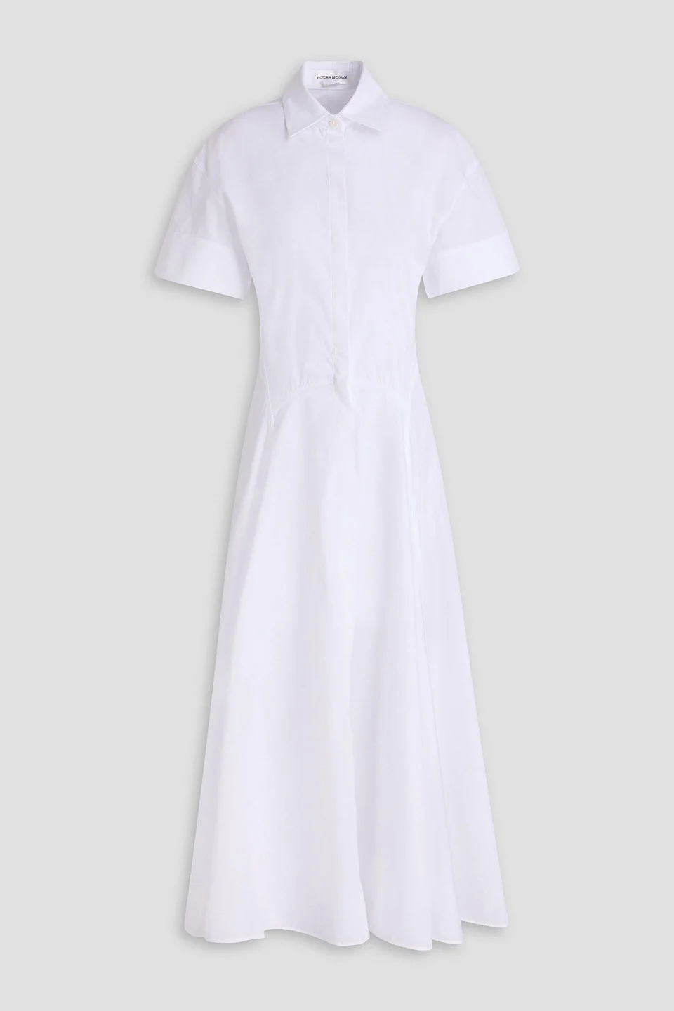 Shirt dress cotton-poplin buttoned cuffs partially concealed button fastenings through front mid-weight, non-stretchy fabric machine wash or dry clean imported This midi shirt dress from Victoria Beckham is made from soft cotton-poplin that drapes beautifully and features buttoned cuffs for a polished touch. Wear it with heels or flats for effortless style at the office or brunch. 100% Organic Cotton Product Code 1647597338669854