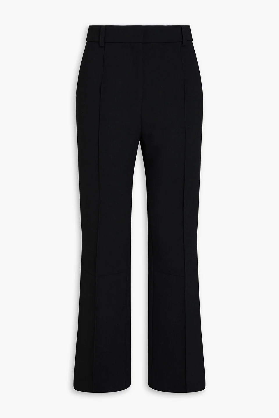 Flared pants crepe stitched front creases side slant pockets back welt pockets high-rise cut concealed hook, button and zip fastening at front mid-weight, non-stretchy fabric dry clean imported 45% Polyester 36% Virgin Wool 16% Polyamide 3% Elastane Product Code 1647597359785364