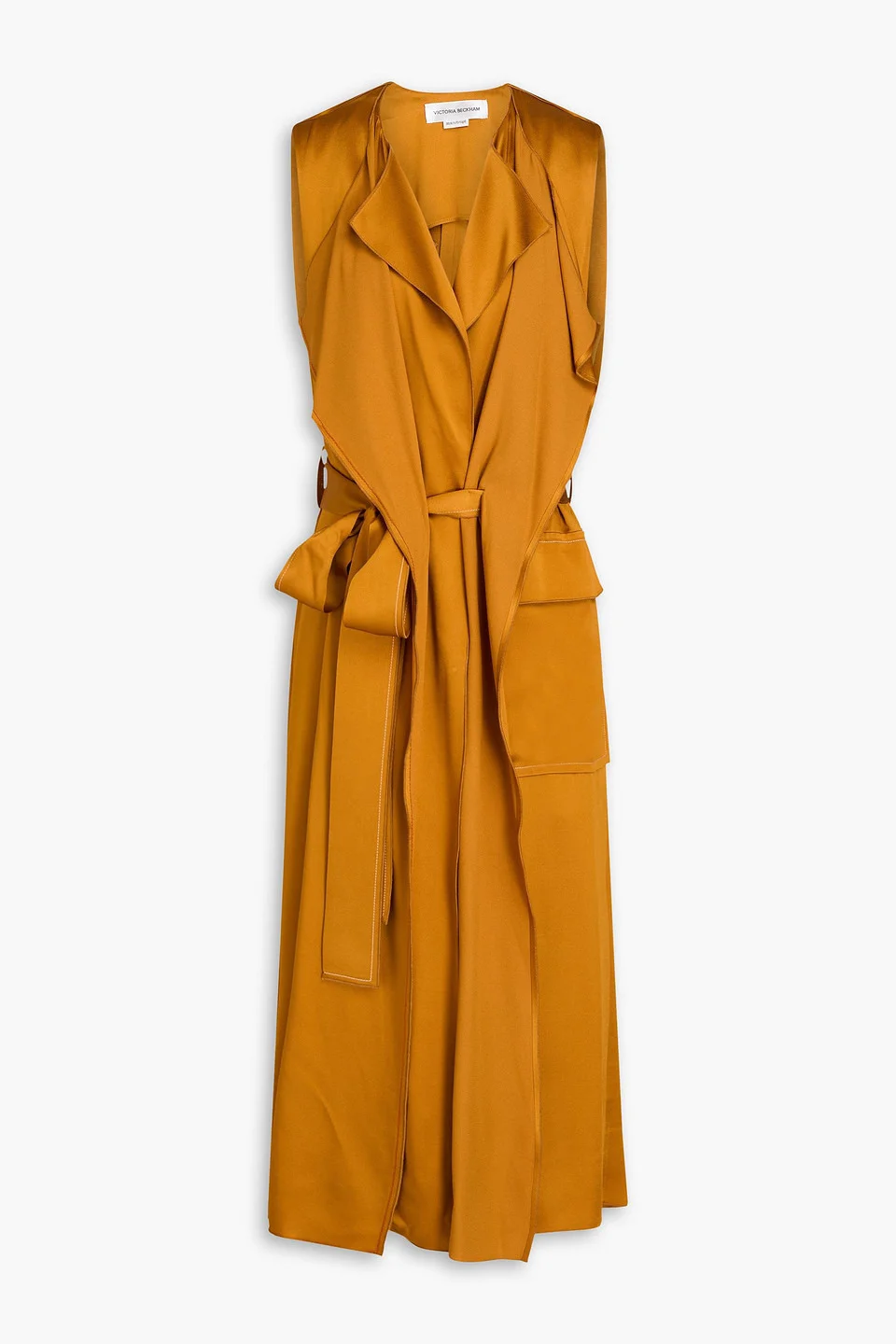 Wrap dress satin draped cutout two side slant pockets back split concealed hook fastenings along back ties at waist mid-weight, non-stretchy fabric dry clean imported 71% Acetate 29% Viscose Product Code 1647597359226998