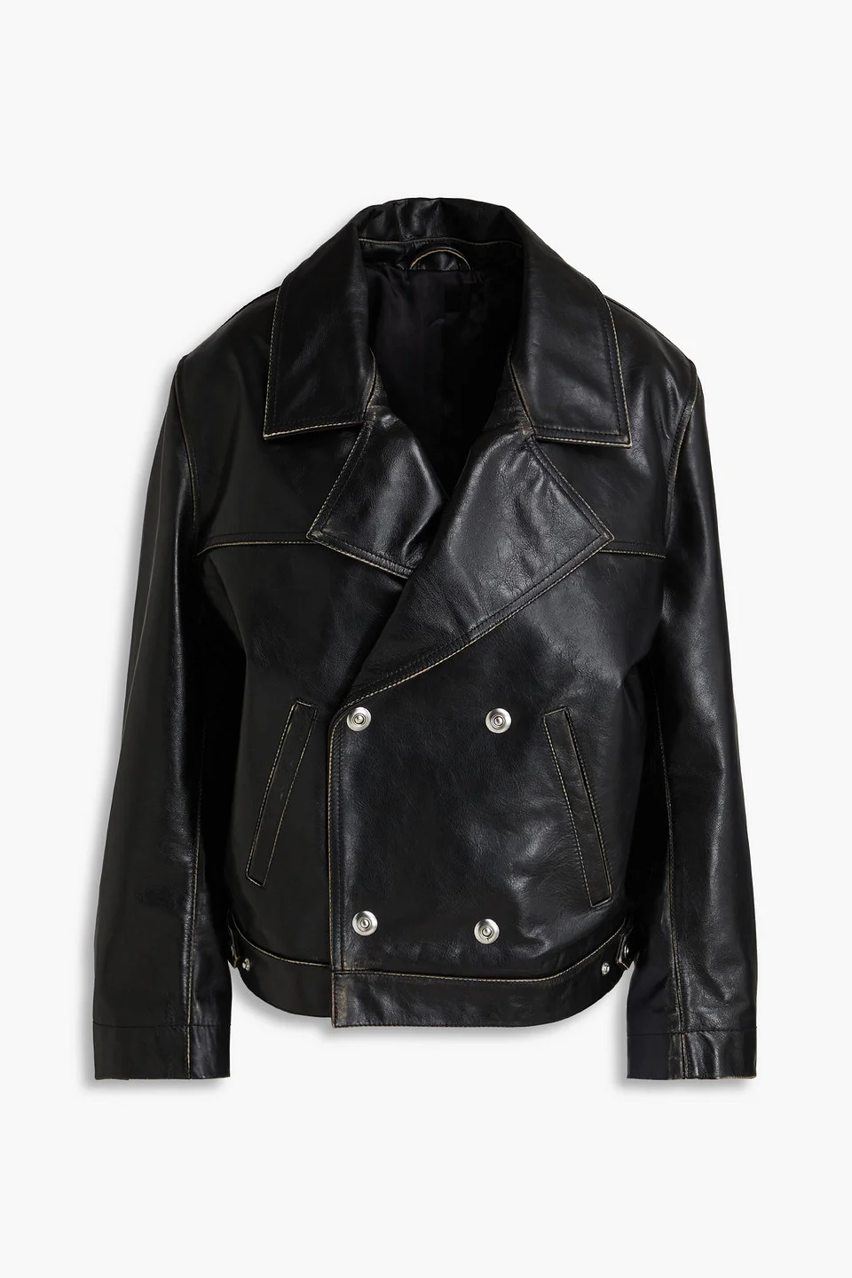 Jacket leather oversized snap-fastening waist tabs two front welt pockets snap fastenings through double-breasted front fully lined firm, non-stretchy leather specialist clean imported 100% Leather Product Code 1647597359236467
