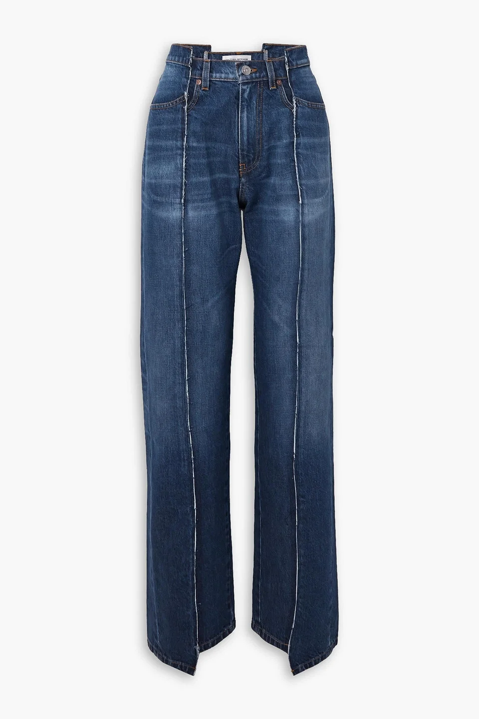 Straight-leg jeans denim paneled belt loops high-rise cut multipockets button and concealed zip fastening at front mid-weight, non-stretchy fabric dry clean made in italy Victoria Beckham's deconstructed jeans look like two similar styles fused together. Complete with a high-rise, off-kilter waistband, they have exposed seams through the straight legs and fall to asymmetric hems. The denim is whiskered and faded to enhance the vintage feel. 100% Cotton Product Code 1647597347700924