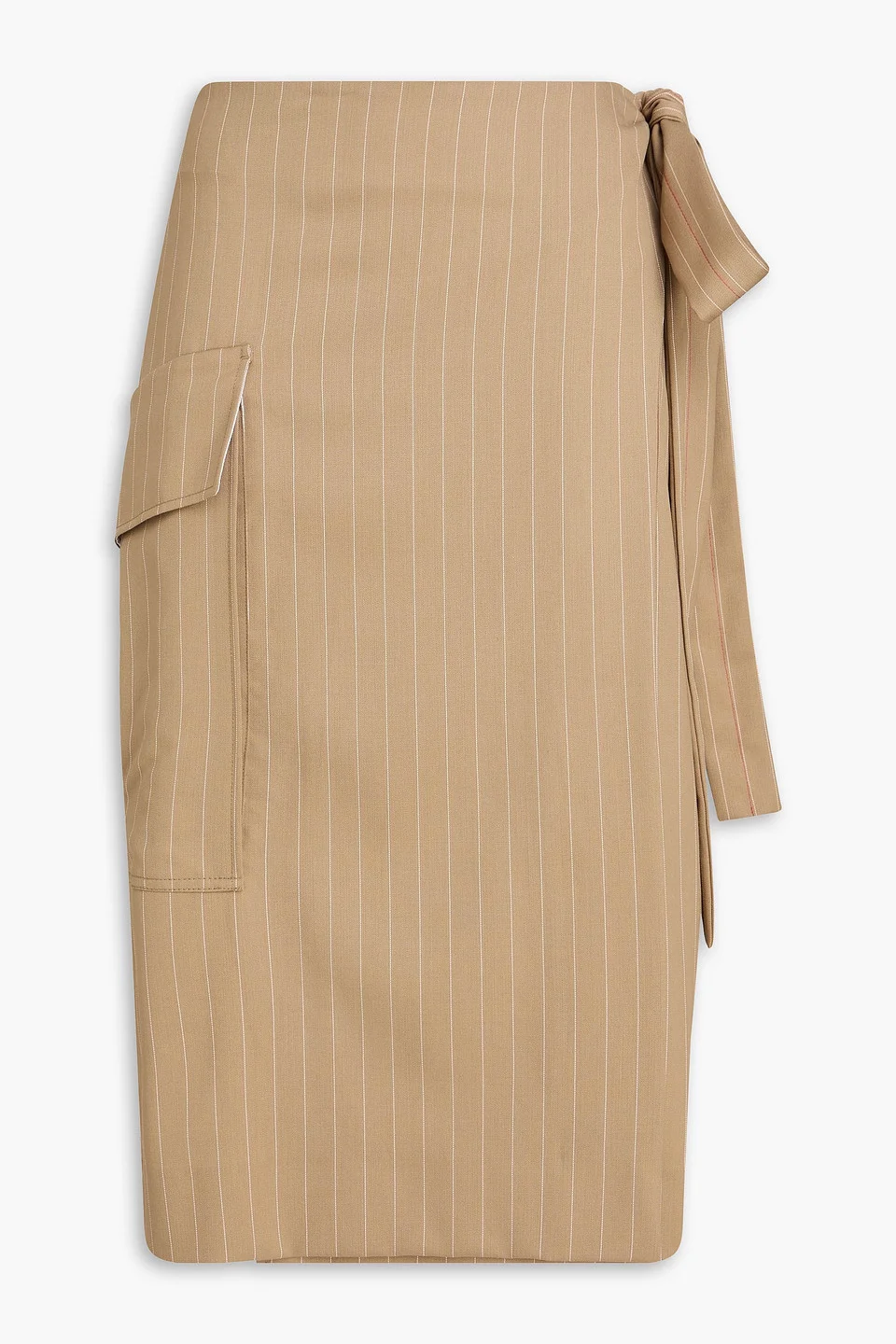 Tie-detailed pinstriped wool-twill midi wrap skirt