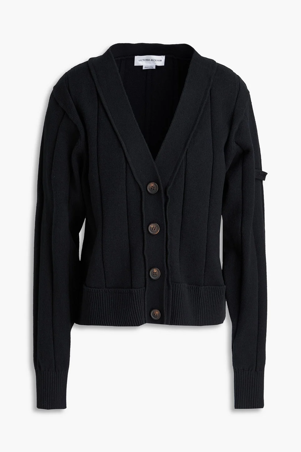 Cardigan cotton-blend ribbed button fastenings through front mid-weight knit dry clean imported Go for something a little more bold with this Victoria Beckham cardigan. Spun from cotton, the wide-set ribbing, buttoned front and subtle logo give a neat, tailored effect that elevates an everyday piece. Wear it for office days or weekend gallery browsing with a sleek trench and ankle boots. 95% Cotton 5% Elastane Product Code 46376663163117218