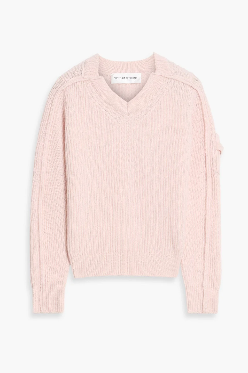 Sweater wool and cashmere-blend ribbed sleeve pocket slips on mid-weight knit dry clean imported There’s so much to love about this Victoria Beckham v-neck sweater; it feels like a closet essential you’ll reach for every week. It has a soft ribbed texture in a wool and cashmere-blend, with a subtle sleeve pocket and a neat v-neck that skims the frame. Wear it with a pencil skirt and pumps for office days or gallery openings. 70% Wool 30% Cashmere Product Code 46376663163073079
