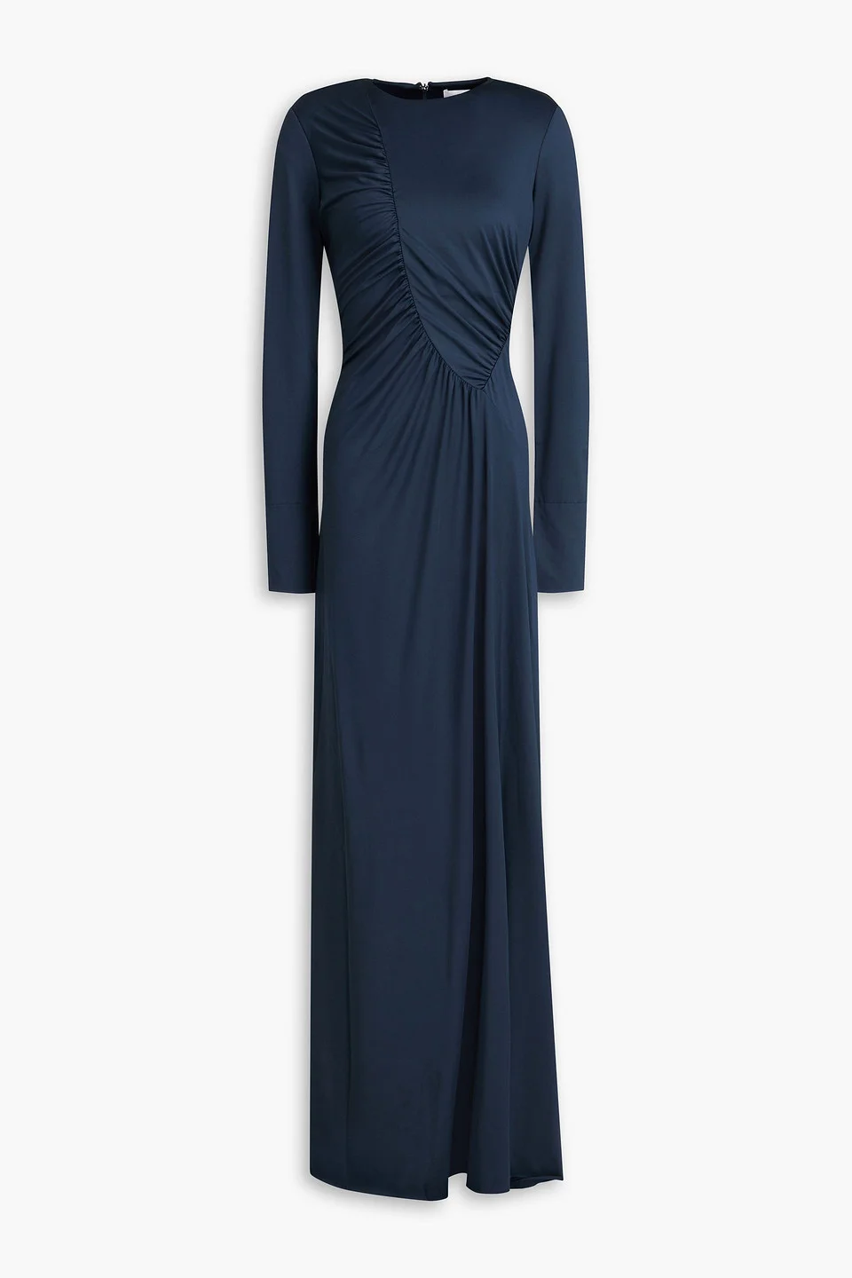 Style yours with strappy sandals for your next dinner party or benefit gown stretch-jersey ruched split cuffs raw-cut hem concealed hook and zip fastening at back mid-weight, stretchy fabric dry clean imported 90% Polyester 10% Elastane Product Code 46376663162926027