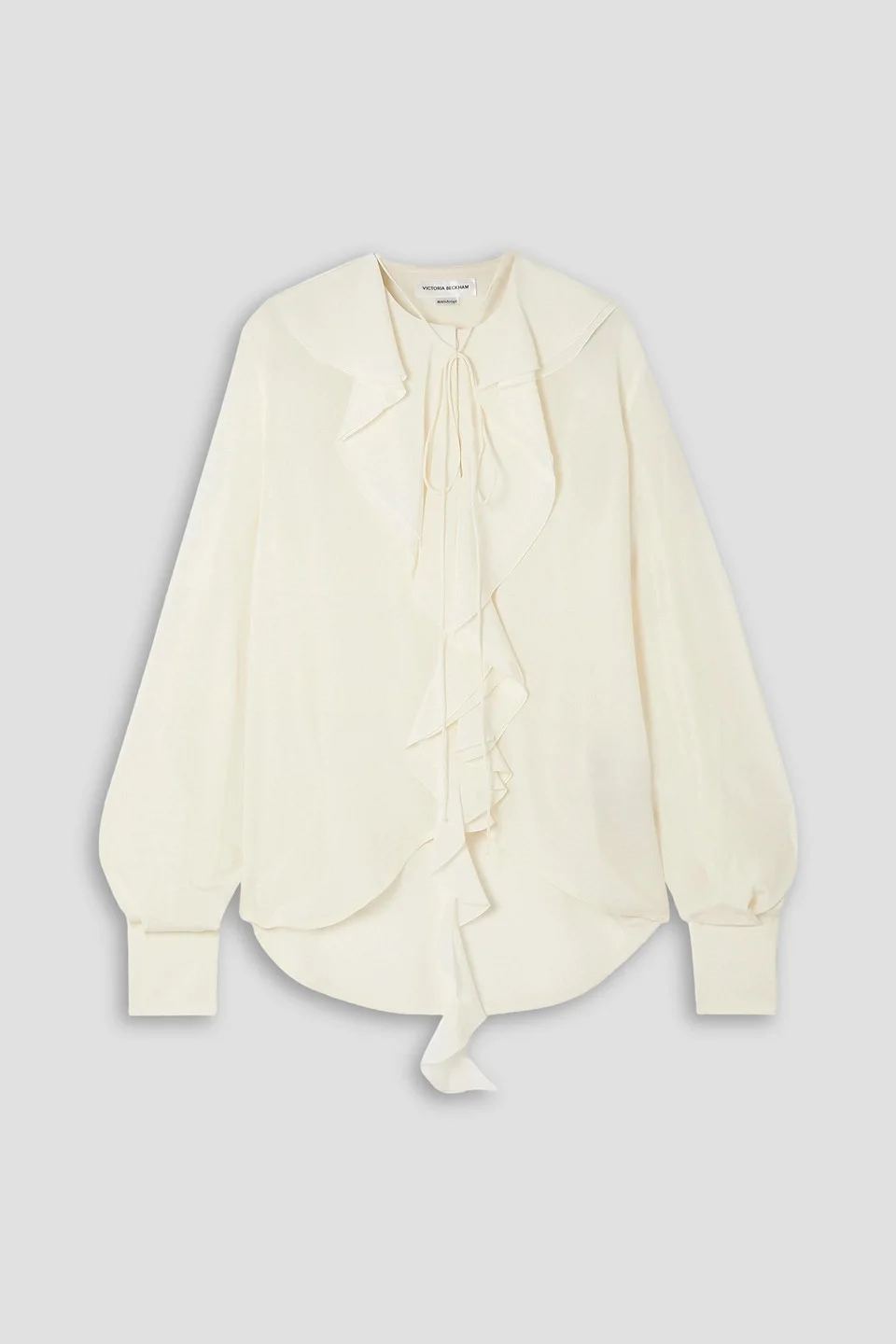 Blouse silk crepe de chine ruffled neckties buttoned cuffs concealed button fastenings through front lightweight, non-stretchy fabric dry clean imported Victoria Beckham's blouse is defined by cascading ruffles that fall from the high neckline to below the hem. It's made from pure silk crepe de chine for fluidity and has elegant blouson sleeves. Style yours with tailored pants for meetings or jeans if you're heading to lunch. 100% Silk Product Code 1647597345887977