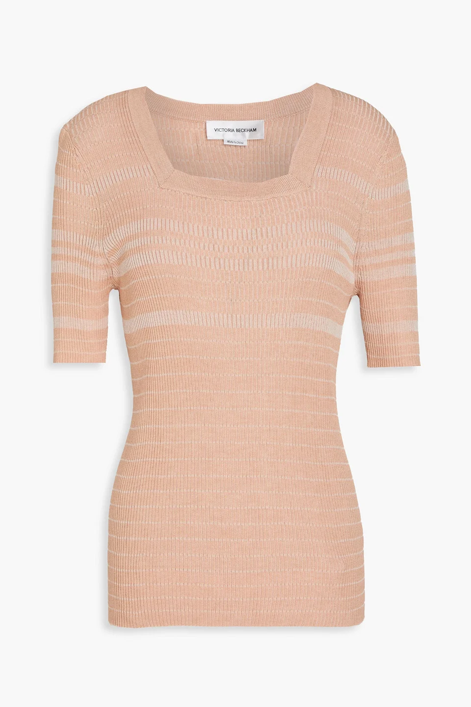 Top striped silk and cotton-blend ribbed slips on lightweight knit dry clean imported Victoria Beckham's knitted top is polished and ultra-wearable, in fact, you'll want to wear it on repeat. It's made from a striped silk and cotton-blend with a square neckline. Wear it tucked into tailored pants and flared jeans. 60% Silk 40% Cotton Product Code 46376663163112731