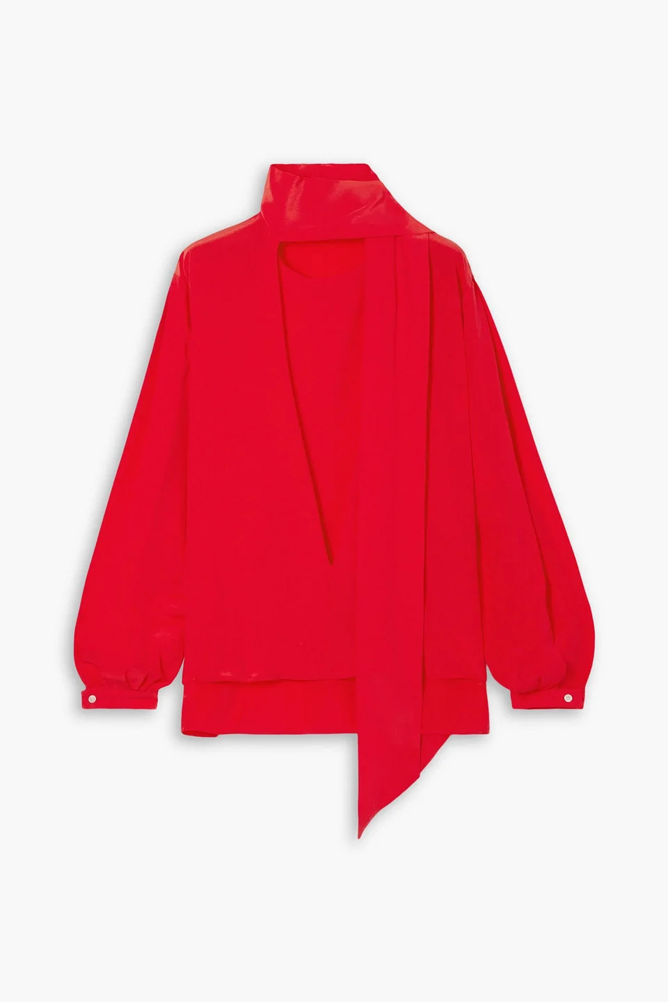 Blouse silk crepe de chine neckties buttoned cuffs side slits button-fastening keyhole at front mid-weight, non-stretchy fabric dry clean imported What we love about Victoria Beckham's designs is that she always makes pieces she herself would wear, you can certainly picture her donning this blouse, tucked neatly into a pair of tailored pants. It's made from silk crepe de chine in a bold red hue and has languid neck ties that wrap around your neck like a scarf. 100% Silk Product Code 1647597345720451
