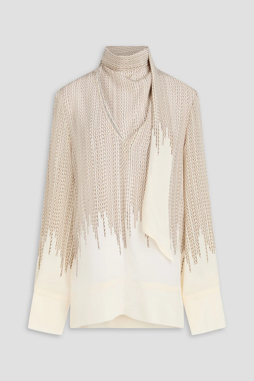 Blouse printed silk crepe de chine draped neckties side slits slips on lightweight, non-stretchy fabric dry clean imported 100% Silk Product Code 46376663162990446
