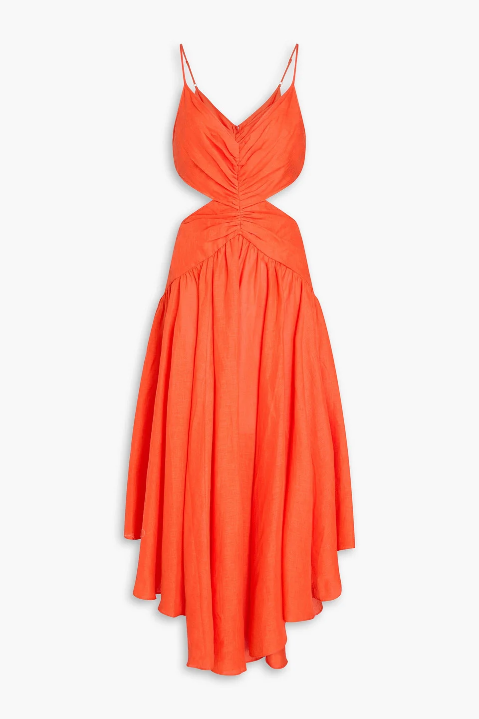 Dress linen cutout adjustable straps asymmetric hem concealed zip fastening along back partially lined mid-weight, non-stretchy fabric dry clean imported Looking for a really great summer dress? Zimmermann's midi is made from vibrant linen with skin-baring cutouts and a striking asymmetric hem. Wear it with strappy sandals for dinners on holiday. 100% Linen Product Code 1647597347318085