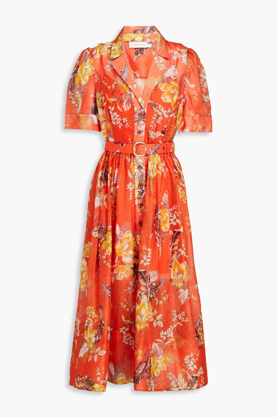 Belted floral-print linen and silk-blend gauze midi shirt dress