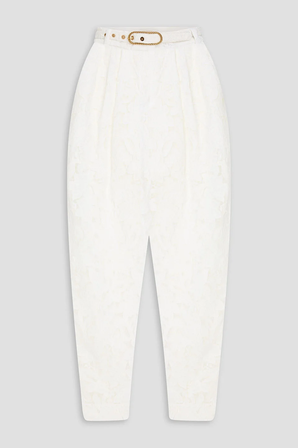 Tapered pants guipure lace pleated detachable belt side slant pockets high-rise cut partially lined mid-weight, non-stretchy fabric dry clean imported There's so much to love about these pretty pants from Zimmermann. The ivory guipure lace and tapered profile create a silhouette that's refined and romantic. Wear it with a white blouse for elegant brunches or bridal festivities. 100% Polyester Product Code 46376663162927829