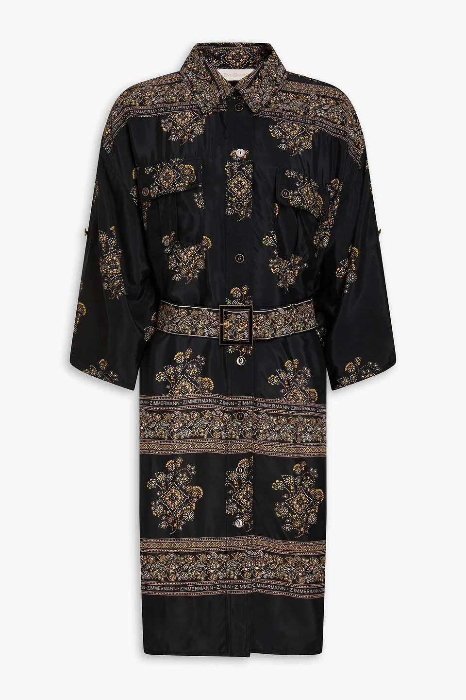 Shirt dress printed satin detachable belt belt loops breast pockets button fastenings through front mid-weight, non-stretchy fabric dry clean imported It's so easy to pin this Zimmermann dress as one of the label's own, thanks in part to the monogrammed trims. It's made from satin with a chic detachable belt and breast pockets. Wear it with mules to go from desk to dinner without hesitation. 70% Viscose 30% Silk Product Code 46376663162927991
