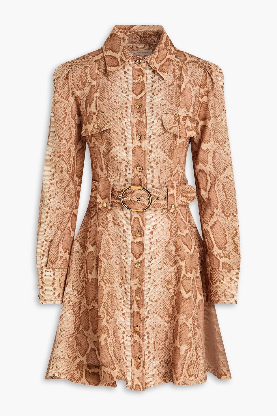 Shirt dress snake-print linen detachable belt belt loops side slit pockets breast pockets button fastenings through front mid-weight, non-stretchy fabric dry clean imported Get ready to turn heads in Zimmermann’s stunning mini shirt dress. Made from linen with a chic snake-print design, it has a detachable belt and pockets for added flair. Wear it with strappy sandals for lunch dates with the girls. 100% Linen Product Code 46376663162934379
