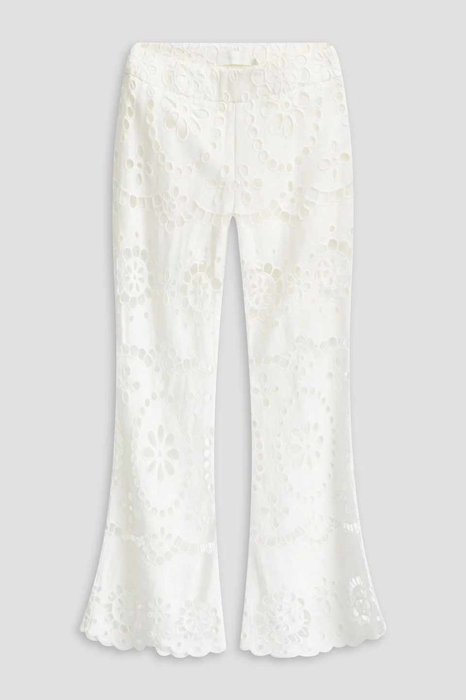 Flared pants broderie anglaise linen scalloped trims high-rise cut partially lined mid-weight, non-stretchy fabric dry clean imported Heading on holiday? Scoop up Zimmermann's flared pants, and fast. The delicate broderie anglaise linen and scalloped trims feel light and playful, while the high-rise cut ensures a flattering fit. They're partially lined for just the right amount of coverage, too. 100% Linen Product Code 1647597355748744