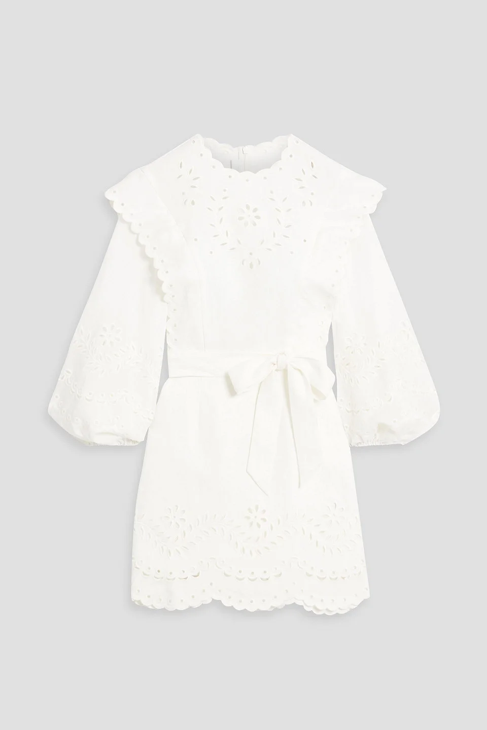 Dress broderie anglaise linen detachable waist tie elasticated cuffs concealed zip fastening along back fully lined mid-weight, non-stretchy fabric dry clean imported 100% Linen Product Code 1647597357428337