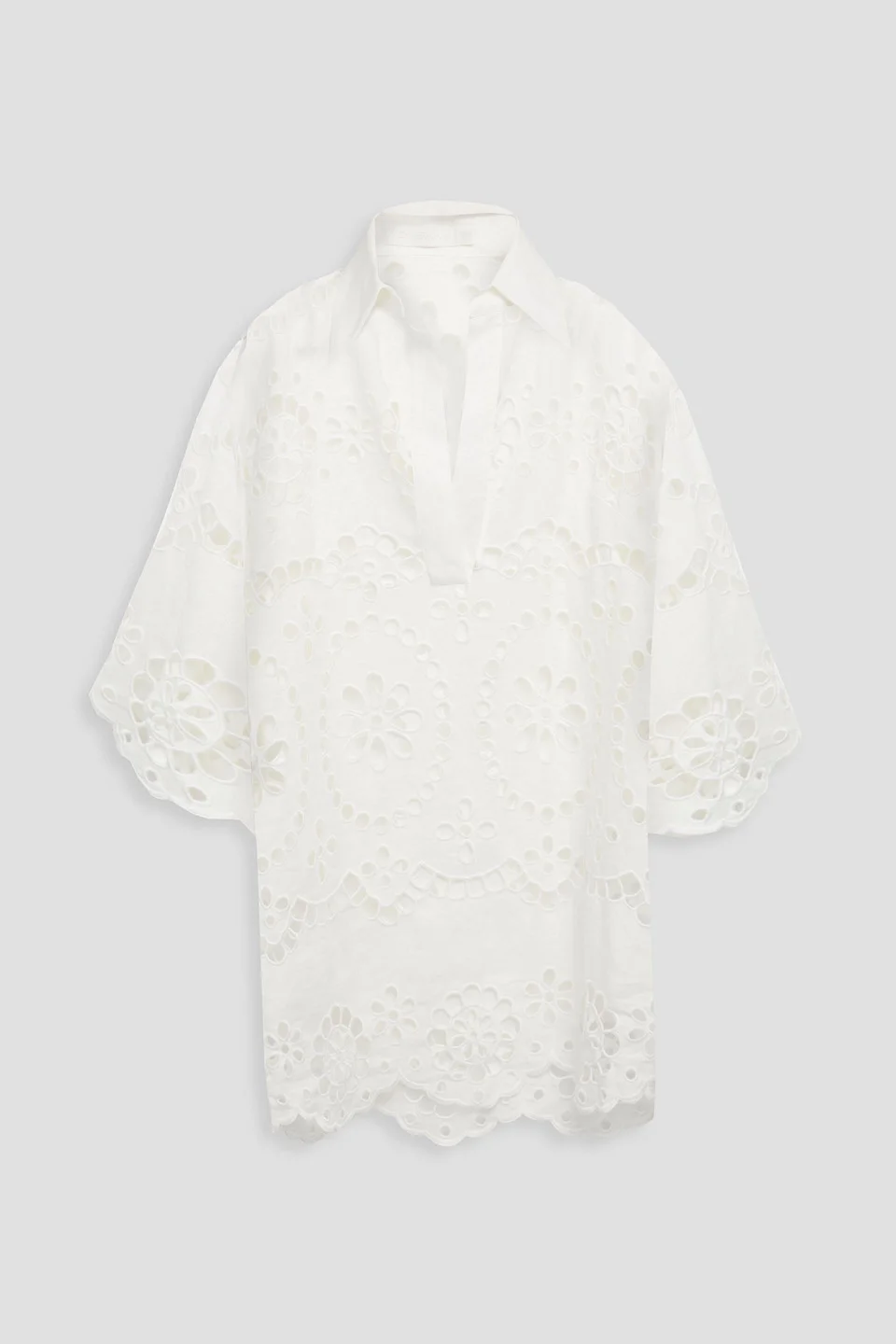 Tunic broderie anglaise linen slips on detachable camisole to line mid-weight, non-stretchy fabric dry clean imported Zimmermann’s romantic tunic is a must-have for your wardrobe. Made from white linen with delicate broderie anglaise detailing, it has a camisole underneath. We like it with the matching pants and neutral sandals. 100% Linen Product Code 1647597355768663