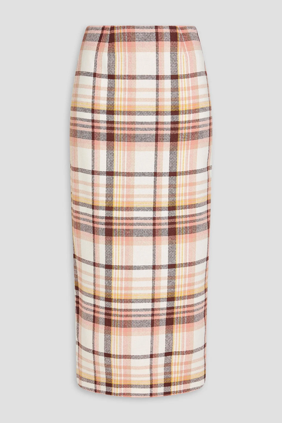 Pencil skirt checked linen and cotton-blend back slit fully lined concealed zip fastening along back mid-weight, non-stretchy fabric dry clean imported Looking for a really great addition to your wardrobe? Zimmermann's pencil skirt is made from a linen and cotton-blend, featuring a chic checked design. The back split ensures you can sit and walk with ease. 57% Linen 43% Cotton Product Code 1647597358971825