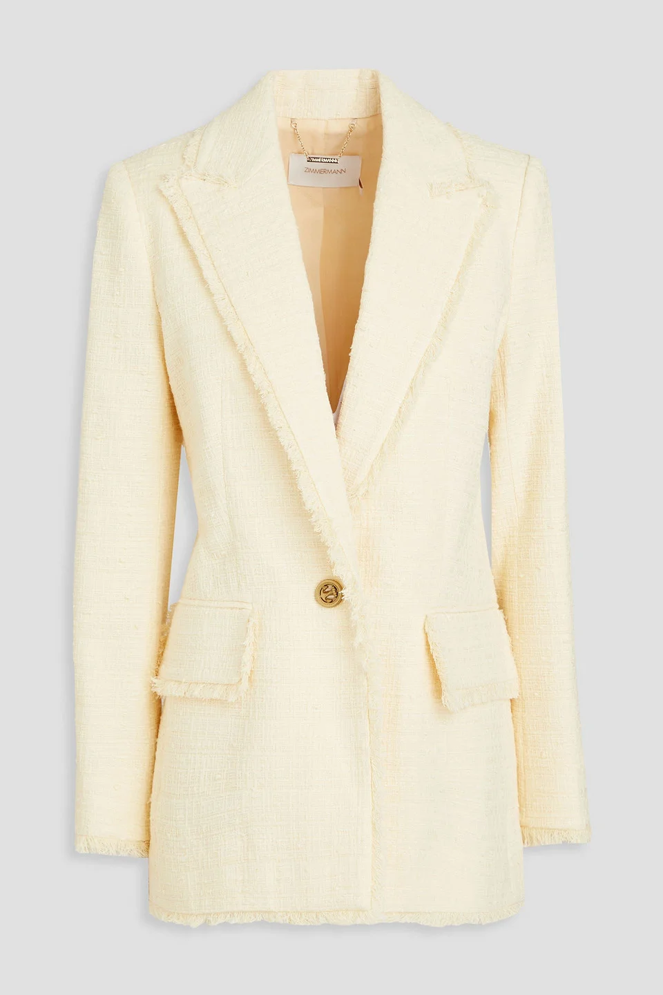 Blazer boucle-tweed cotton-blend shoulder pads frayed trims non-functioning buttoned cuffs two front flap pockets button fastening at front fully lined back vent mid-weight, non-stretchy fabric dry clean imported Zimmermann's cream blazer is an easy way to make any look fee sophisticated. It's made from cotton-blend boucle-tweed with frayed trims and padded shoulders for a confident silhouette. Wear it to the office or to brunch, and watch as all eyes turn to you. 83% Cotton 10% Viscose 7% Polyester Product Code 1647597334484838