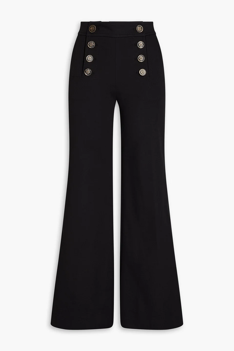 Flared pants cotton-blend button-embellished pressed creases two side slant pockets two back flap pockets high-rise cut mid-weight, slightly stretchy fabric dry clean imported 58% Cotton 40% Viscose 2% Elastane Product Code 1647597359419406