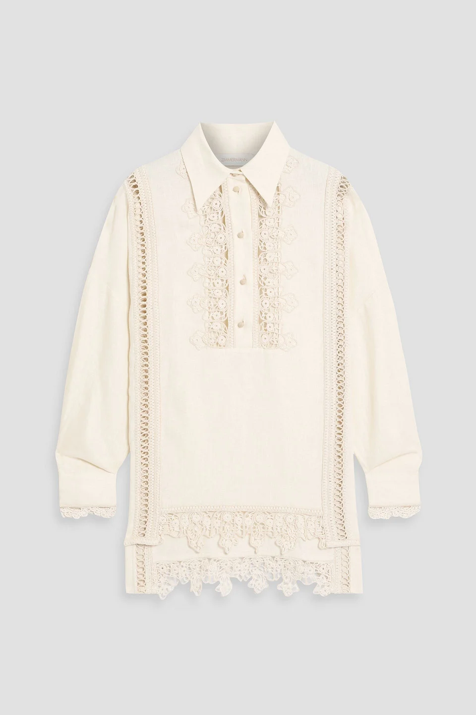Shirt linen crochet trims buttoned cuffs button fastenings along front mid-weight, non-stretchy fabric dry clean imported We love Zimmermann's linen shirt with the coordinating pants, just add mules and delicate jewelry. It has romantic lace inserts and a pointed collar for added polish. 100% Linen Product Code 46376663163122693