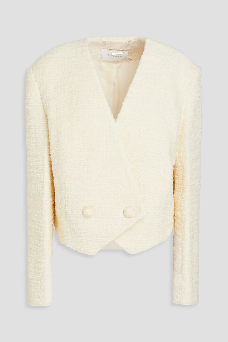 Blazer tweed wool-blend shoulder pads cropped button fastenings through double-breasted front fully lined mid-weight, non-stretchy fabric dry clean imported Elevate your everyday style with Zimmermann’s cropped blazer. Made from wool-blend tweed, it has a double-breasted front and structured shoulder pads for a polished look. Wear it over a turtleneck or a sleek shirt for a sophisticated vibe. 99% Wool 1% Polyamide Product Code 1647597356284346