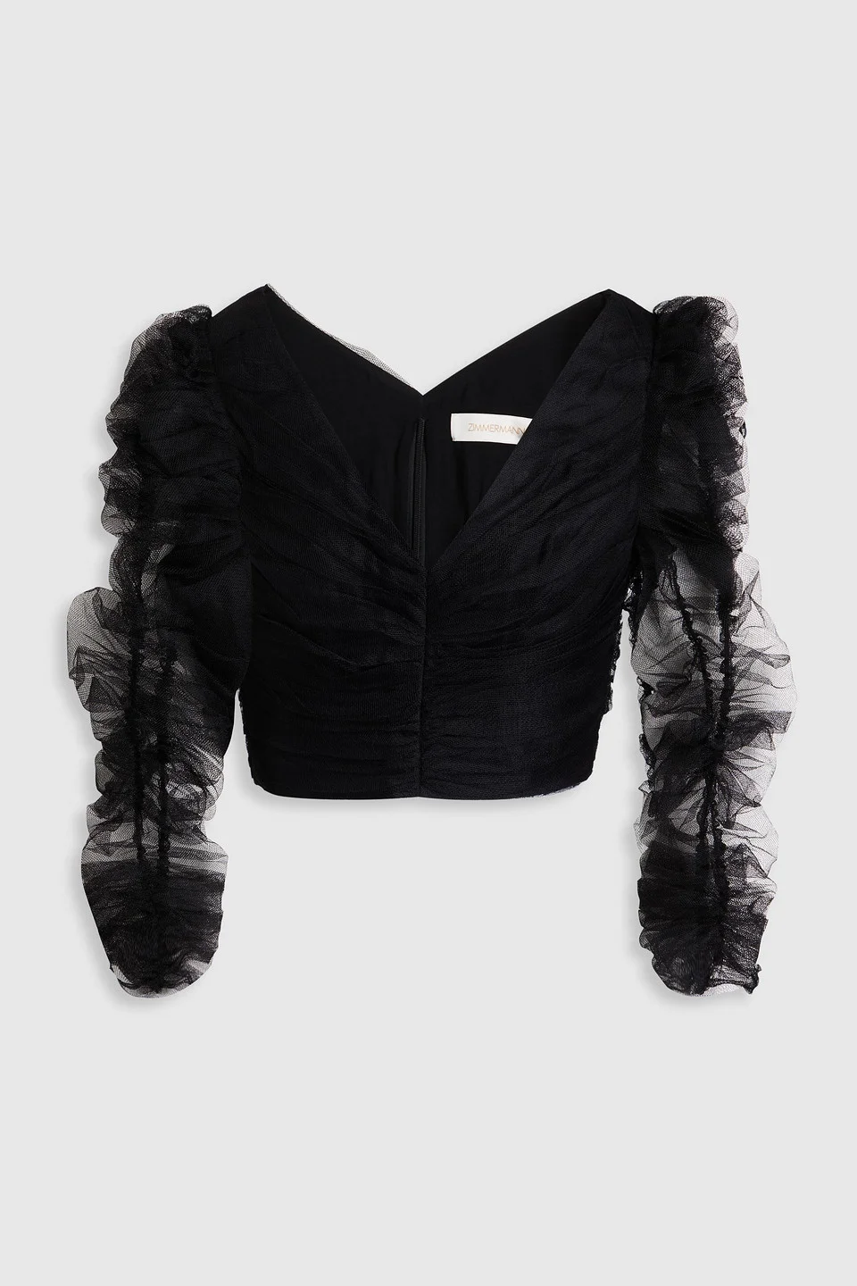 Blouse tulle ruched cropped zip fastening along back partially lined lightweight, non-stretchy sheer fabric dry clean imported There's so much to love about this stunning cropped blouse from Zimmermann. Made from lightweight tulle with a ruched design, it feels ultra-femme and flirty. Just add tailored pants or a full skirt for a night out. 100% Polyamide Product Code 1647597342458399