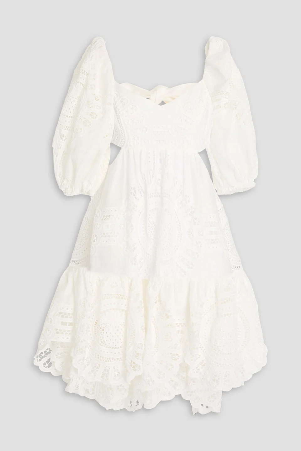 Dress linen broderie anglaise cutout elasticated cuffs scalloped hem ties at back concealed hook and zip fastening at back internal boning mid-weight, non-stretchy fabric dry clean imported Zimmermann's mini dress feels so femme and flirty. Made from white linen with intricate broderie anglaise cutouts and a scalloped hem, it’s perfect for summer outings and showing off a fresh tan. We like it with neutral accessories. 100% Linen Product Code 1647597347320274