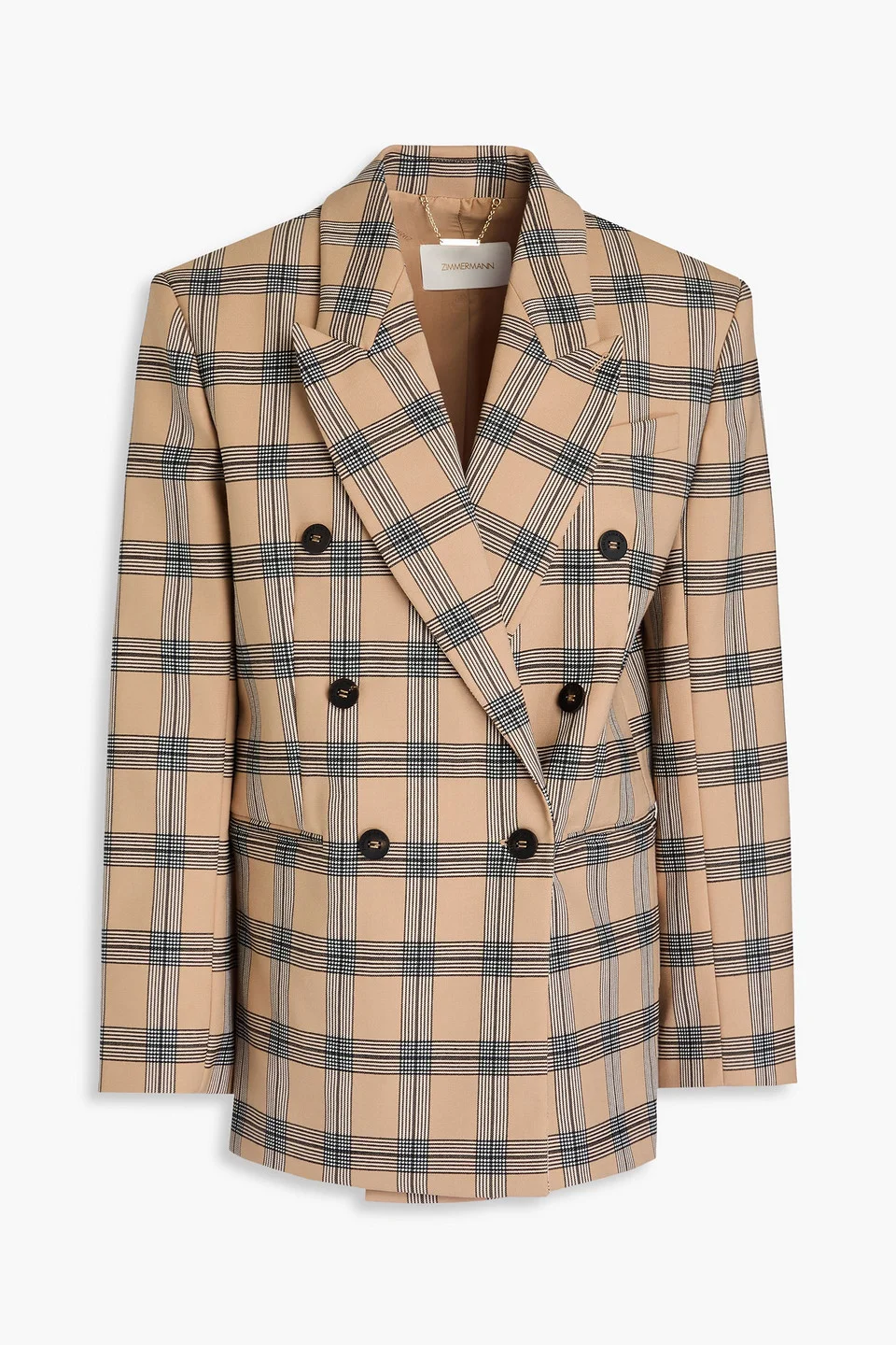 Blazer checked twill shoulder pads buttoned cuffs breast pocket front welt pockets button fastening at double-breasted front fully lined back vent mid-weight, non-stretchy fabric dry clean imported We love a statement jacket, mostly because they're endlessly wearable and so easy to style. This checked blazer from Zimmermann has padded shoulders and slim silhouette. Pair with denim or tailored pants. 51% Polyester 44% Wool 5% Elastane Product Code 1647597355763544