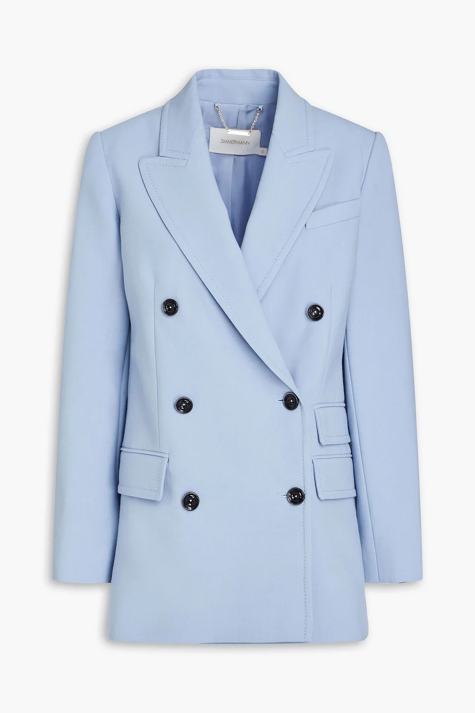 Blazer crepe shoulder pads buttoned cuffs breast pocket front flap pockets button fastenings through double-breasted front fully lined dual back vents mid-weight, slightly stretchy fabric dry clean imported Zimmermann's blazer will become a cornerstone piece in your wardrobe. Crafted from mid-weight crepe, its sophisticated design and tailored fit ensure you quietly stand out in any crowd. Pair the 'Blizzard' blue colorway with black trousers or an ultra-femme skirt. 53% Polyester 43% Virgin Wool 4% Elastane Product Code 1647597358740296