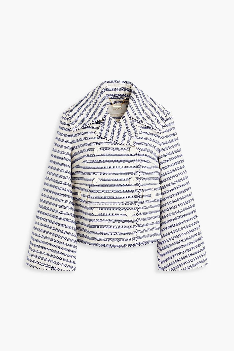 Jacket striped tweed cotton-blend shoulder pads bell sleeves two front patch pockets button fastenings through double-breasted front partially lined mid-weight, non-stretchy fabric dry clean imported We see ourselves wearing Zimmermann's jacket in so many ways. Made from a cotton-blend tweed, it showcases a blue and white striped pattern and roomy bell sleeves. Wear it with tailored trousers, denim or a sleek skirt. 57% Cotton 25% Polyester 14% Acrylic 4% Polyamide Product Code 1647597334483826