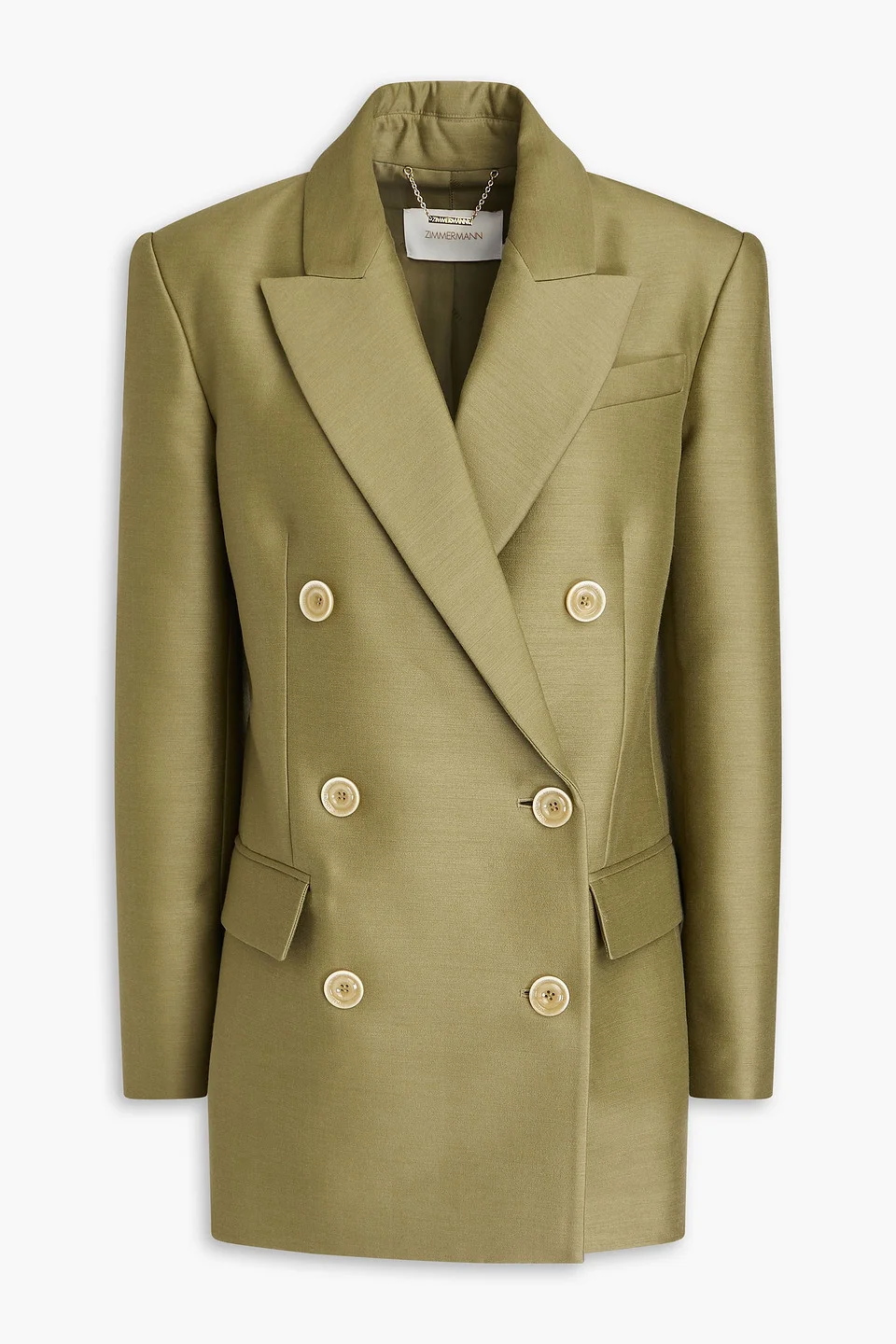 Blazer wool and silk-blend shoulder pads buttoned cuffs breast pocket front flap pockets button fastenings through double-breasted front fully lined dual back vents mid-weight, non-stretchy fabric dry clean imported Looking for a really great addition to your wardrobe? Zimmermann's double-breasted blazer is made from a blend of wool and silk, complete with shoulder pads for a polished look. Wear it with tailored trousers or a chic skirt for an effortlessly sophisticated vibe. 92% Wool 8% Silk Product Code 46376663162914404