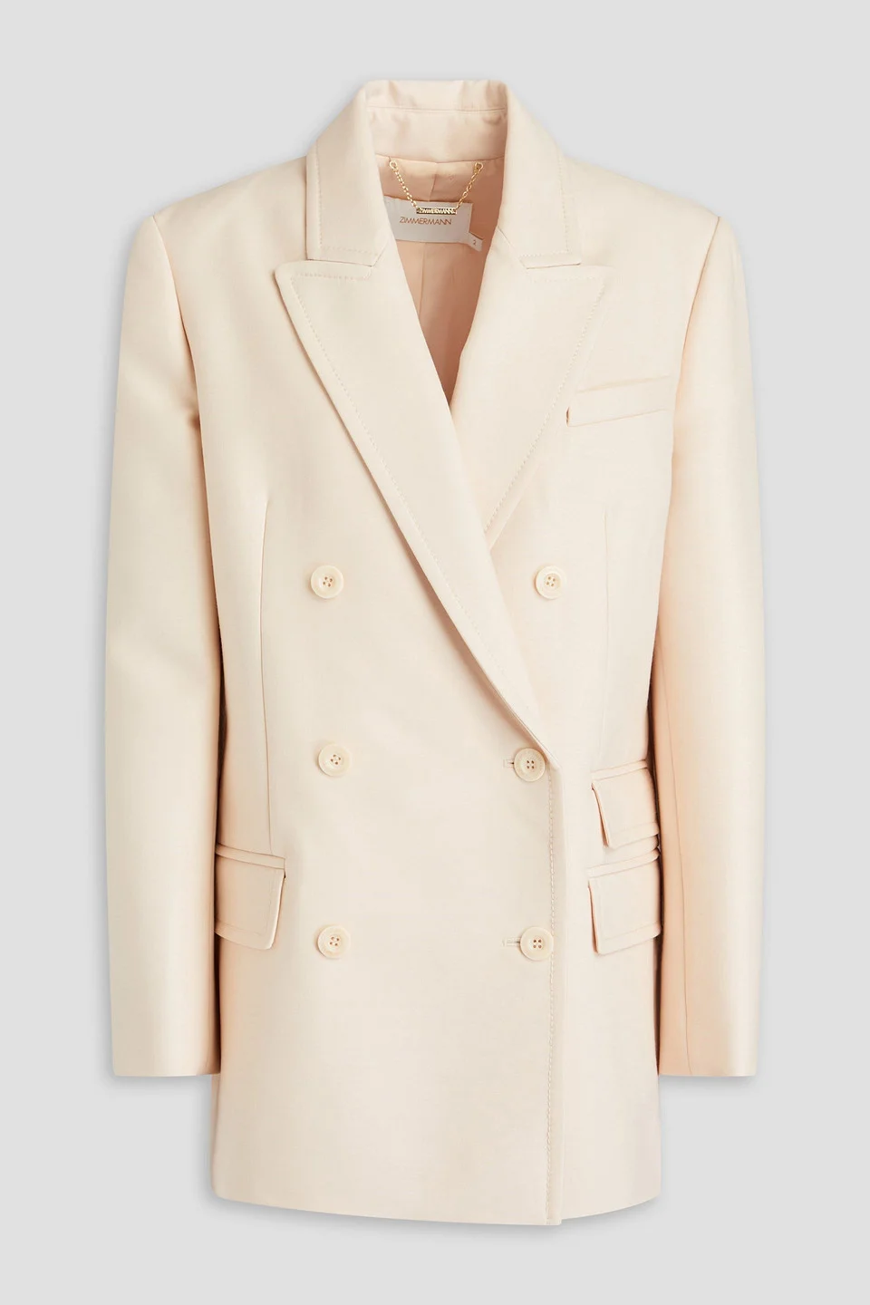Blazer wool-blend shoulder pads buttoned cuffs three front flap pockets breast pocket button fastenings through double-breasted front fully lined dual back vents mid-weight, non-stretchy fabric dry clean imported Zimmermann's blazer will become a cornerstone piece in your wardrobe. Crafted from a wool-blend, its sophisticated design and tailored fit ensure you quietly stand out in any crowd. Wear it with a slinky dress, denim or flared pants. 65% Wool 35% Viscose Product Code 1647597342606780