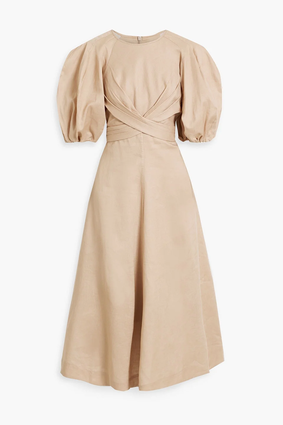 Dress linen wrap-effect puffed sleeves two side slit pockets concealed zip fastening along back fully lined mid-weight, non-stretchy fabric dry clean imported Zimmermann’s midi dress is woven from linen that beautifully holds its shape while feeling like a breeze to wear. It has dramatic puffed sleeves and a wrap-effect bodice that defines the waist before falling to a full skirt. The timeless, neutral colorway is versatile and chic. 100% Linen Product Code 46376663162863619