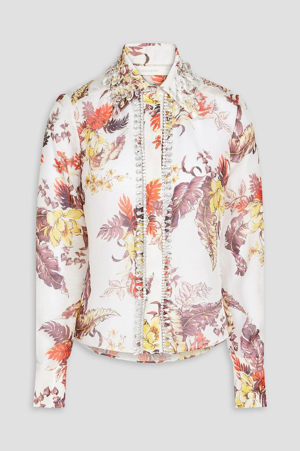 Shirt floral-print linen and silk-blend embellished buttoned cuffs partially concealed button fastenings through front mid-weight, non-stretchy fabric dry clean imported There's so much to love about this stunning floral-print shirt from Zimmermann. Made from a blend of linen and silk, it has crystal embellishments around the collar and button-front. Wear it with tailored pants or the matching skirt. 52% Linen 48% Silk Product Code 1647597355762043