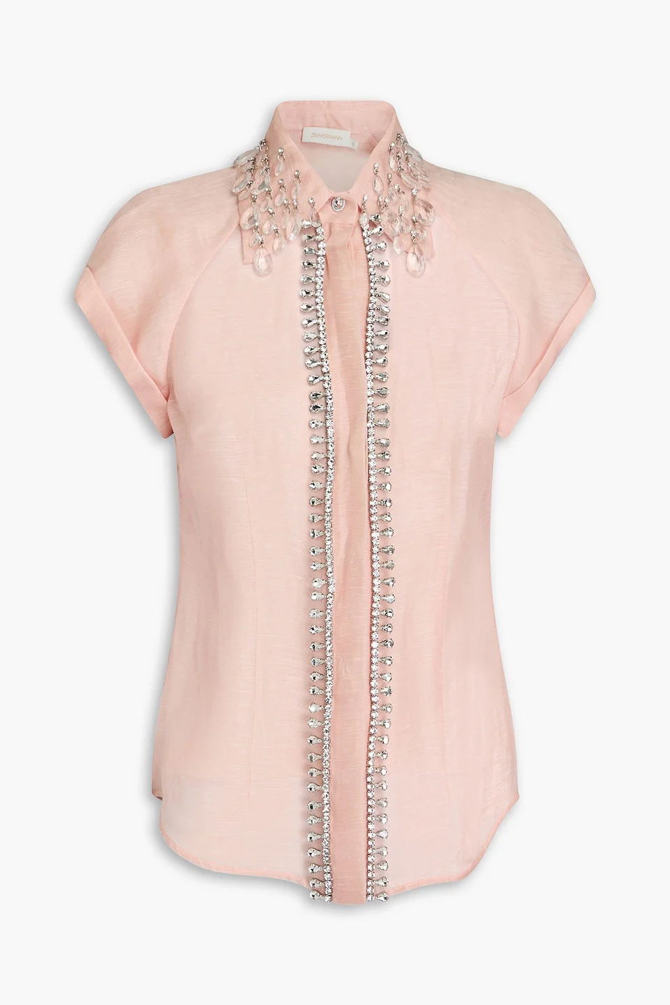 Shirt organza linen and silk-blend crystals partially concealed button fastenings through front detachable camisole to line lightweight, non-stretchy fabric dry clean imported Zimmermann’s shirt has just the right amount of sparkle, don't you think? It's made from a blend of linen and silk with crystal embellishments that catch the light beautifully. We like it with a floral skirt and mules. 52% Linen 48% Silk Product Code 1647597356331593