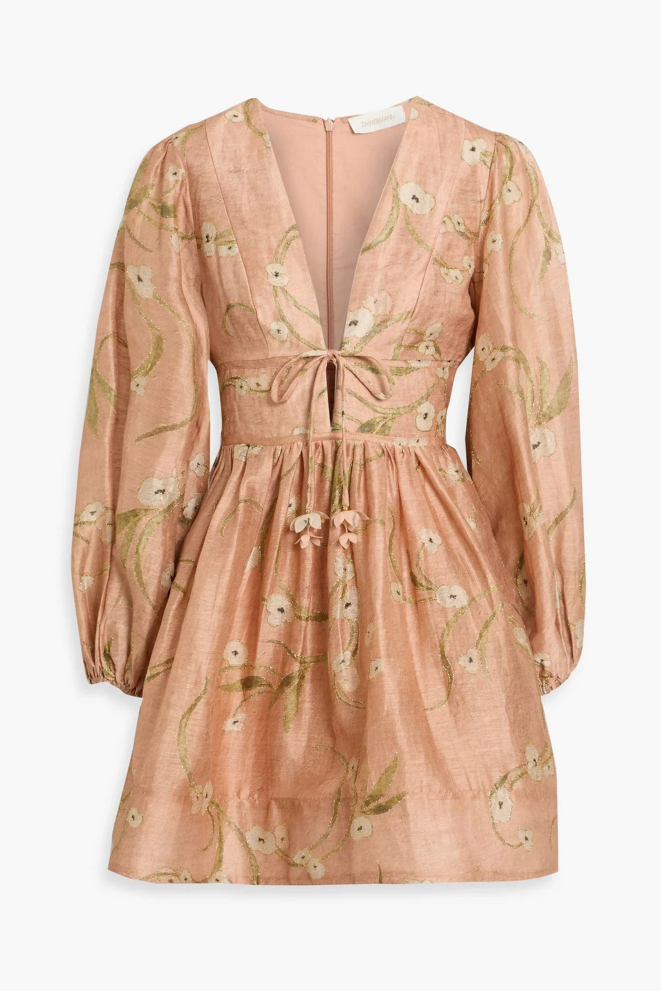 Dress floral-print linen and silk blend-gauze embroidered metallic trim bow-detailed elasticated cuffs side slit pockets concealed zip fastening along back partially lined lightweight, non-stretchy fabric dry clean imported Zimmermann's floral-print mini dress is oh so pretty. Made from linen and silk-blend gauze, it’s soft but structured. The puffed sleeves and bow details add the right amount of romance, along with the dusty pink color. Wear it with metallic sandals to accent the gold threads embroidered throughout the dress. 91% Linen 9% Silk Product Code 46376663163122199