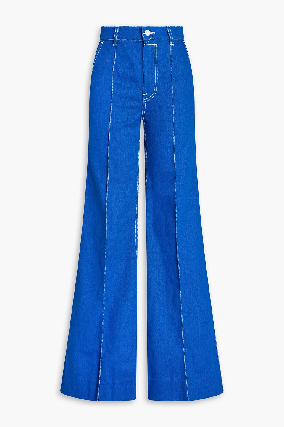 Flared jeans denim stitched front creases belt loops high-rise cut multipockets button and concealed zip fastening at front non-stretchy fabric mid-weight fabric hand wash or dry clean imported please visit the editor's notes for more information on designer size conversions Looking for a statement pair of jeans? Zimmermann's flared style are made from bright-blue denim with white topstitching. Just add a crocheted shirt and you're ready for lunch with the girls. 100% Cotton Product Code 1647597332291065