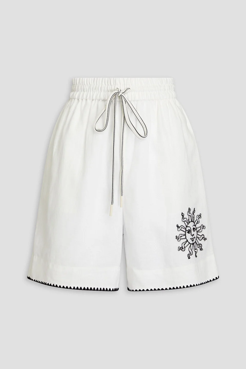 Shorts linen embroidered elasticated drawstring waist high-rise cut back patch pocket two side slit pockets mid-weight, non-stretchy fabric dry clean imported Zimmermann’s embroidered shorts are a must-have for your vacation wardrobe. Made from soft linen, they have a drawstring waist and convenient side pockets. Wear them with a cropped top and sandals for casual brunches. 100% Linen Product Code 1647597333837117