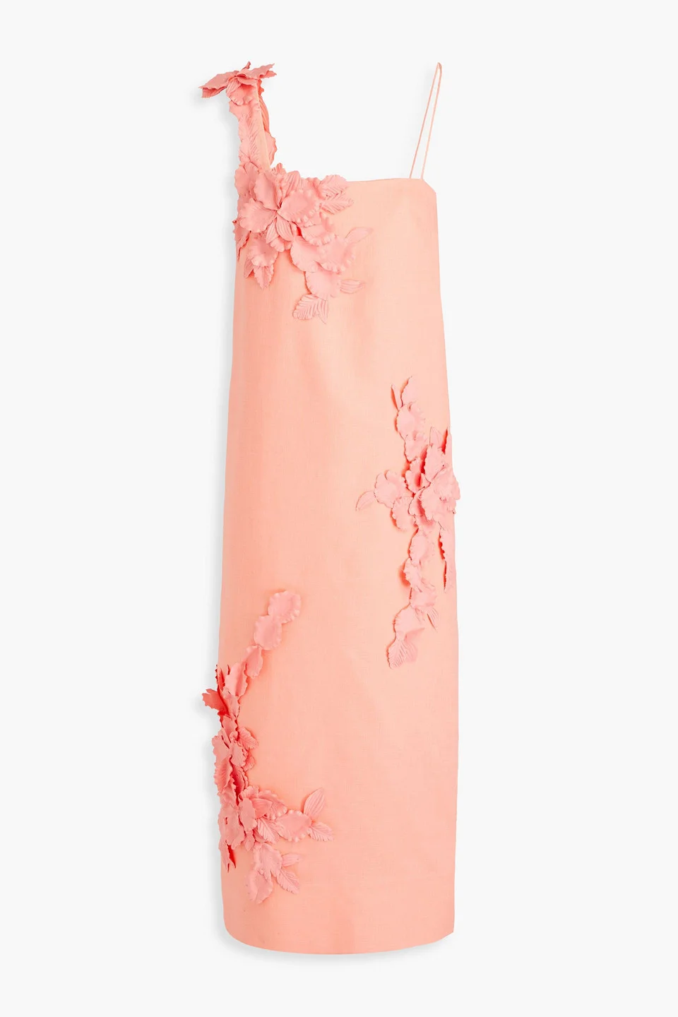 Dress linen floral appliques two side slit pockets back slit concealed zip fastening along back fully lined non-stretchy fabric mid-weight fabric dry clean imported You can't help but feel pretty wearing Zimmermann's peach dress. This midi is made from linen and adorned with floral appliques that add a charming touch. We love the illusion one-shoulder silhouette, too. 100% Linen Product Code 1647597333384855