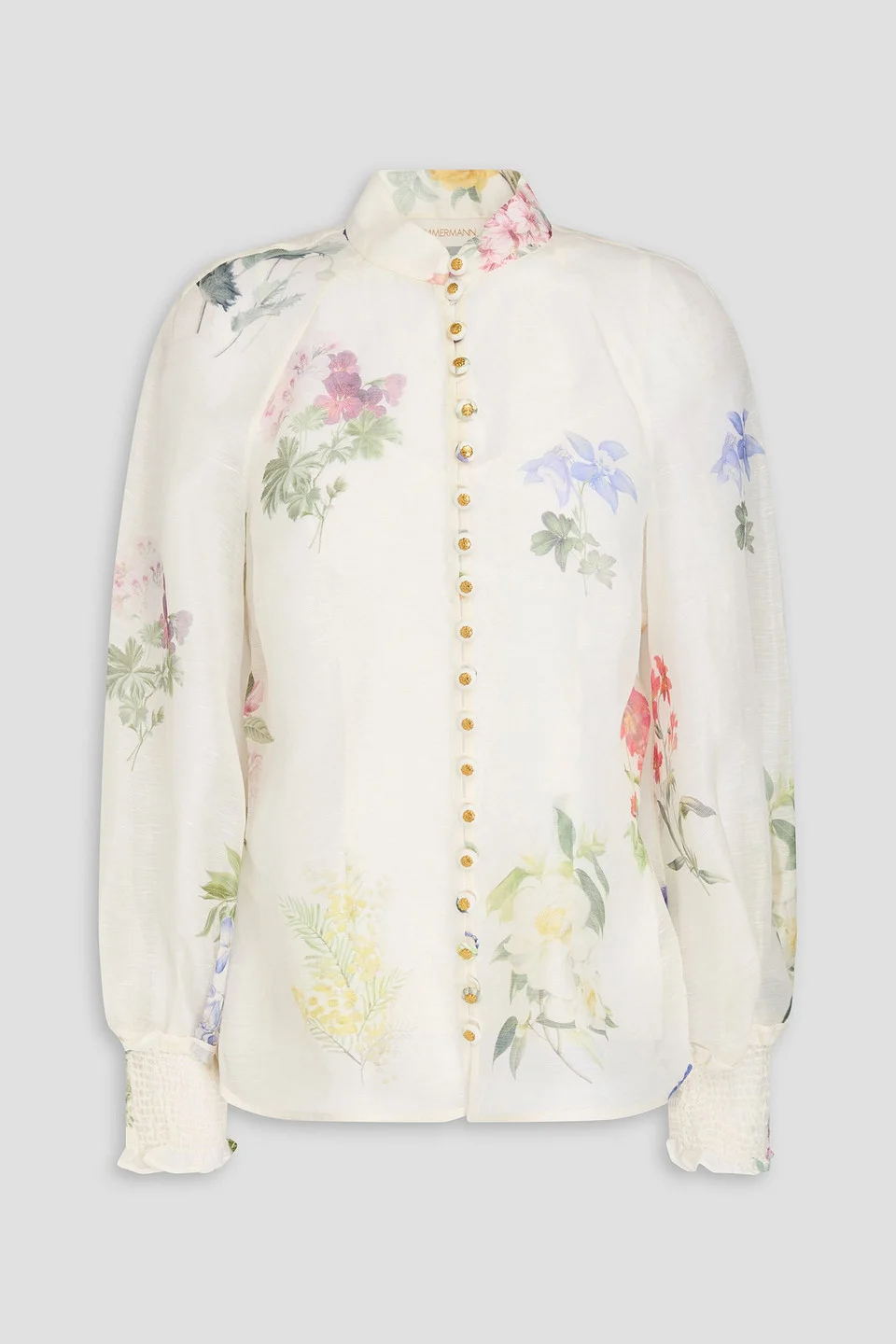 Blouse floral-print linen and silk blend-gauze shirred cuffs button fastenings through front detachable camisole to line lightweight, non-stretchy fabric dry clean imported There’s so much to love about this stunning blouse from Zimmermann. Made from a lightweight linen and silk-blend, it showcases a beautiful floral-print and shirred cuffs for a touch of elegance. It has a camisole underneath, too. 53% Linen 47% Silk Product Code 46376663162888002