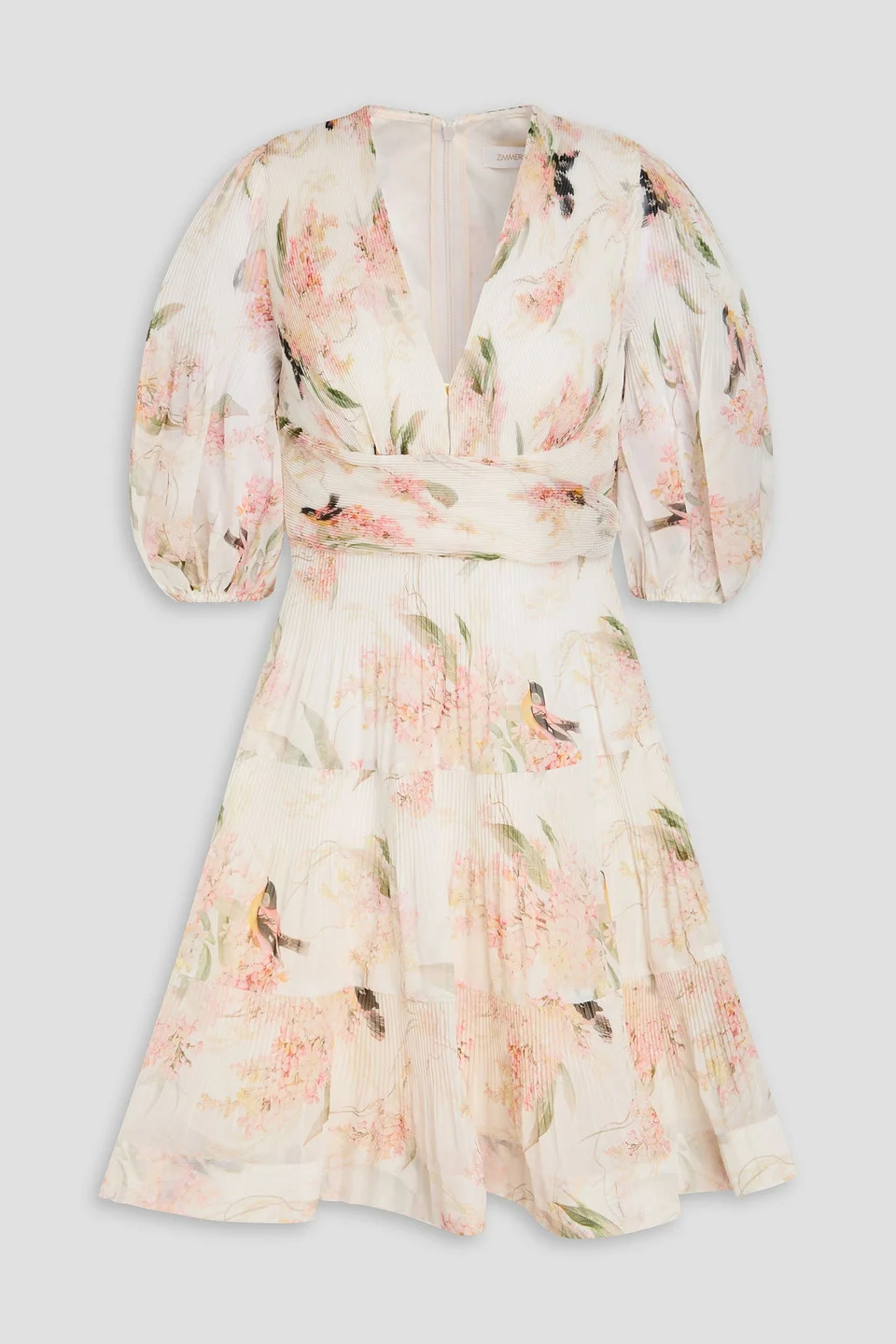 Dress floral-print organza plisse puffed sleeves flared hem concealed button fastening at front concealed zip fastening along back fully lined lightweight, non-stretchy fabric dry clean imported Zimmermann's floral-print mini is an absolute dream. It’s crafted from plisse-organza with a tiered skirt and femme puffed sleeves. We like it with strappy sandals and a glam bag. 100% Polyester Product Code 46376663162927743