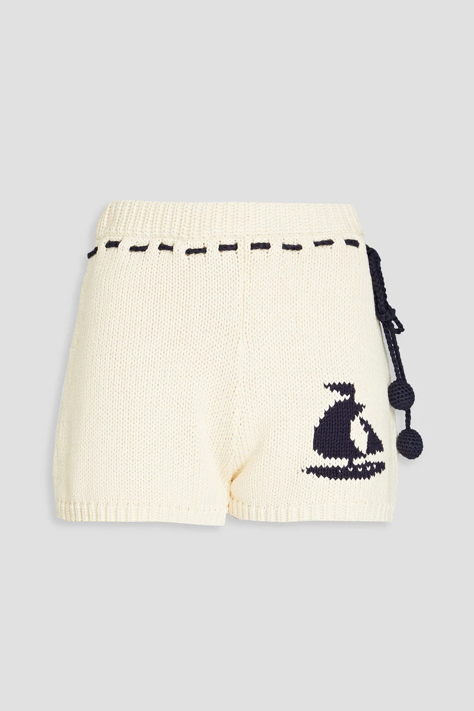 Shorts cotton intarsia-knit ribbed trims drawstring waist high-rise cut mid-weight knit hand wash or dry clean imported Is coastal romance your vacation vibe? You'll want to add Zimmermann's shorts to basket, and to your packing list. Made from soft cotton with ribbed trims and a high-rise cut, they offer both comfort and style. Wear them with the matching top and sandals. 100% Cotton Product Code 1647597332946872