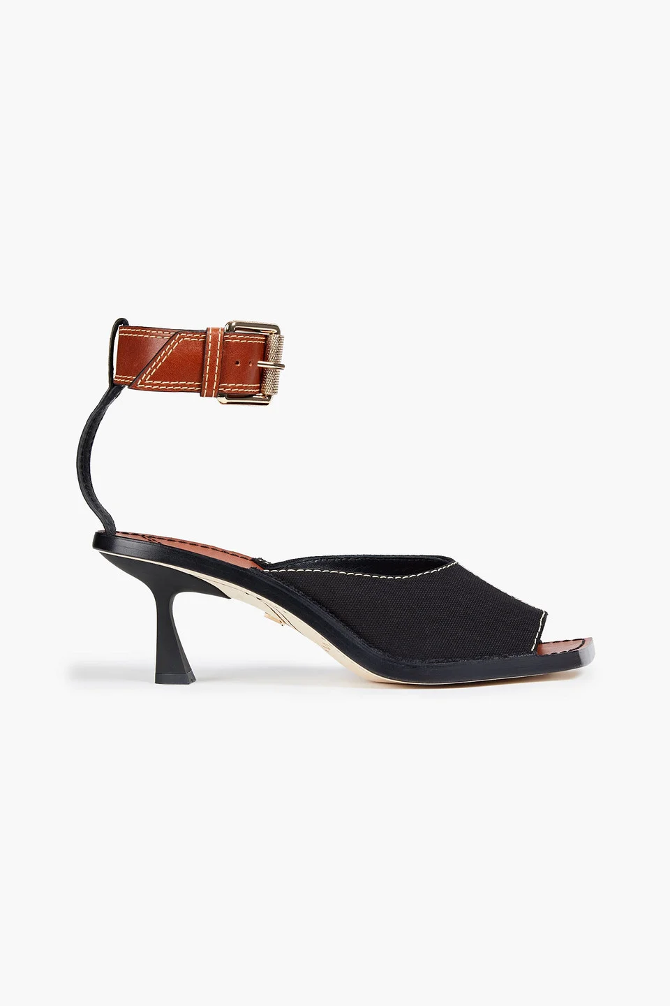 Sandals canvas leather trims topstitching open square toe buckle-fastening ankle strap lined in leather leather sole imported 100% Textile fibers Product Code 38063312418536573