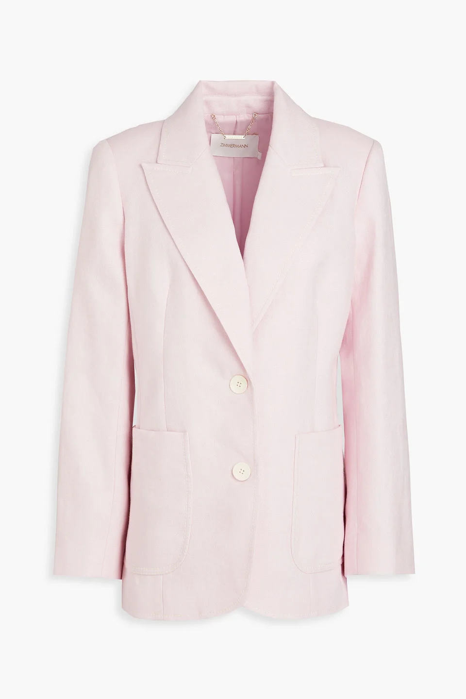 Blazer linen topstitching shoulder pads buttoned cuffs two front patch pockets button fastening at front fully lined back vent mid-weight, non-stretchy fabric dry clean imported Of course Zimmermann's tailoring is every bit as romantic as its dresses. This stunning pink blazer is made from linen with a button front and shoulder pads for a polished look. Wear it with tailored pants and heels for the office or a night out. 100% Linen Product Code 1647597334497775