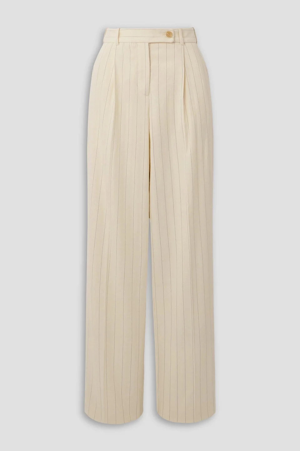Wide-leg pants pinstriped herringbone wool and cotton-blend pleated front slant pockets back welt pockets high-rise cut mid-weight, non-stretchy fabric dry clean imported 86% Wool 14% Cotton Product Code 1647597346682744