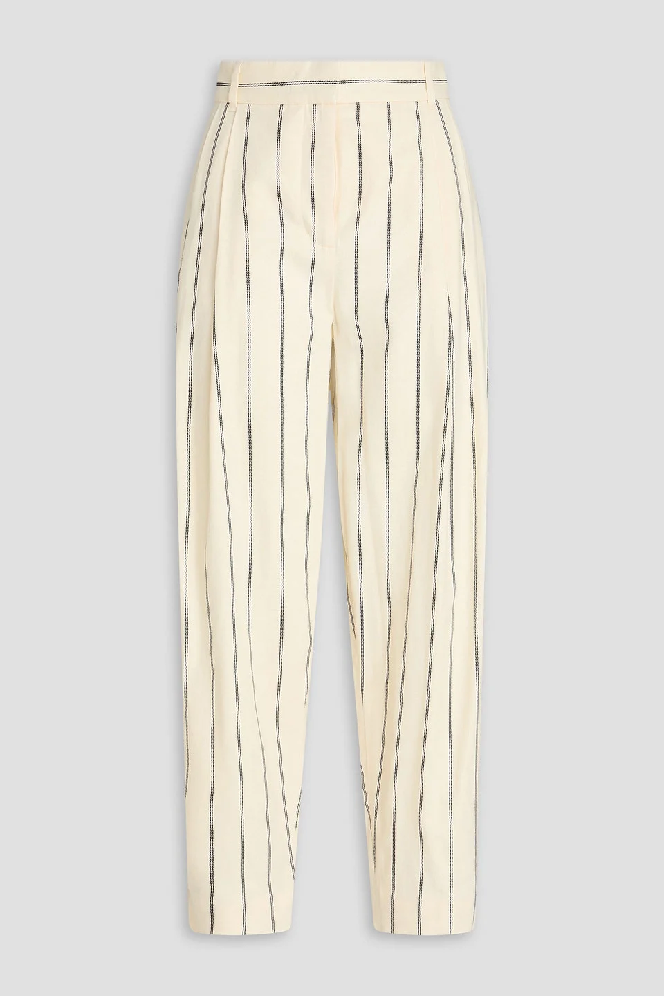 Tapered pants striped linen-blend pleated side slant pockets belt loops high-rise cut concealed hook, button and zip fastening at front mid-weight, non-stretchy fabric dry clean imported How to look sophisticated in the heat? Easy, Zimmermann's pinstriped pants. They're made from linen in a tapered silhouette with pleats down the front. We like them with a tailored vest and sandals. 55% Linen 42% Viscose 3% Elastane Product Code 46376663162914324
