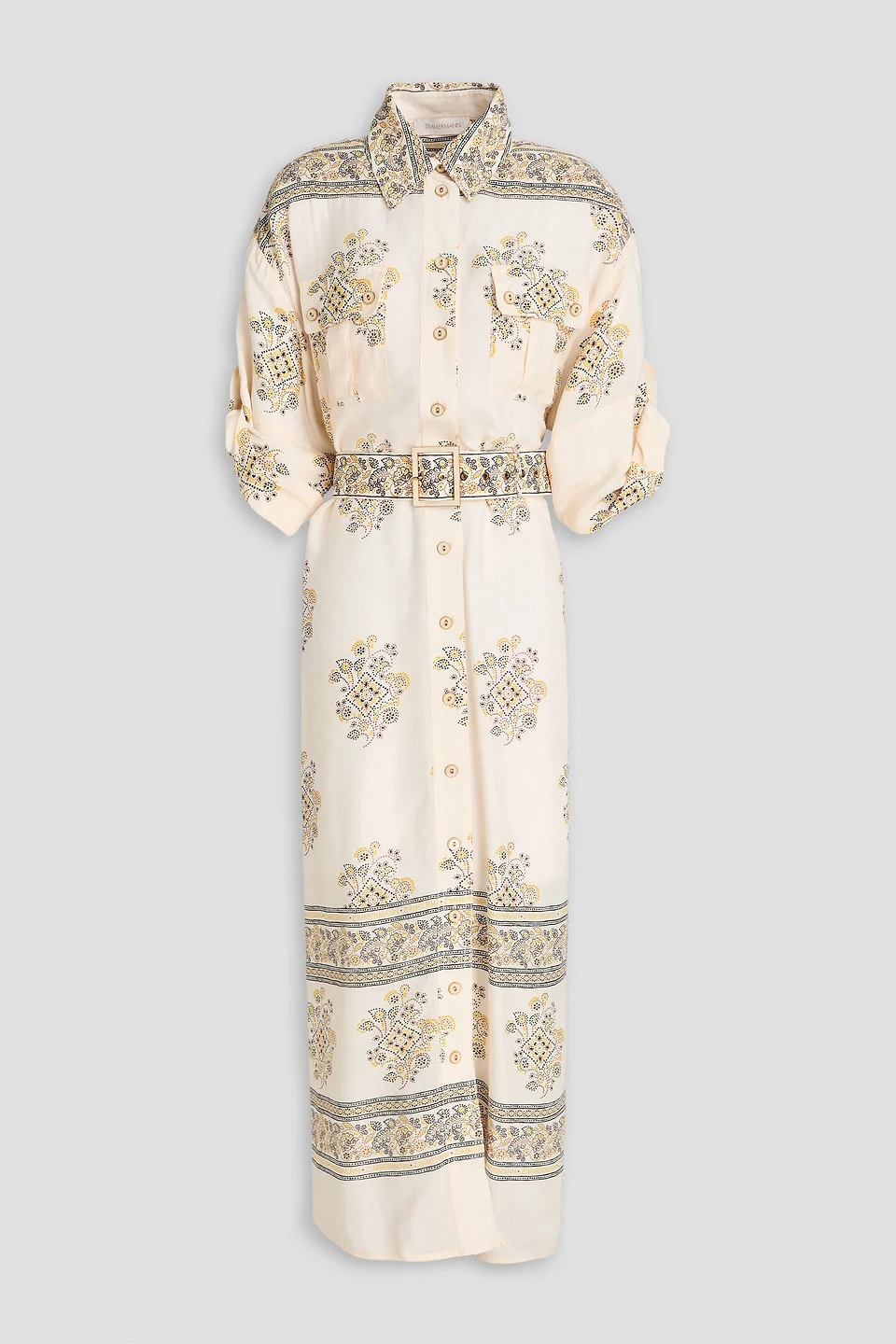 Shirt dress printed crepe de chine buttoned sleeve tabs pleated back detachable belt two front flap pockets button fastenings through front mid-weight, non-stretchy fabric dry clean imported Your next wardrobe hero is found in this beautiful dress by Zimmermann. It's made from printed crepe de chine and has a coordinating belt that cinches the waist. Just add sandals and expect endless compliments. 70% Viscose 30% Silk Product Code 46376663162888642