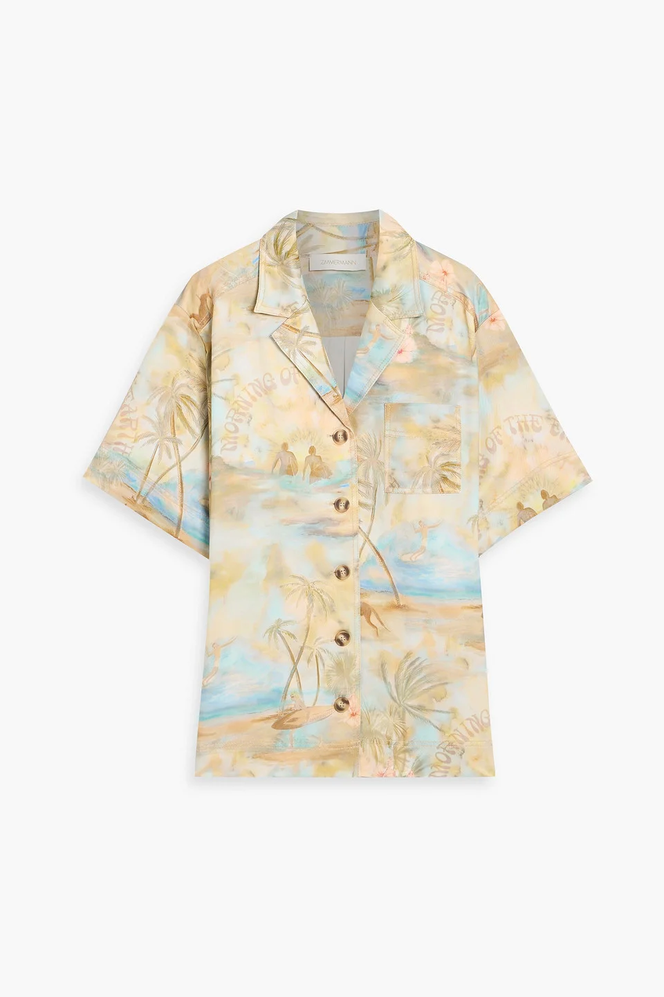 Shirt printed twill breast pocket button fastenings through front mid-weight, non-stretchy fabric dry clean imported The picturesque scene on Zimmermann's shirt looks a lot like paradise, so even if you're not heading on holiday you'll be transported. It's cut from twill with a camp collar and wide sleeves. 100% Viscose Product Code 46376663163122731